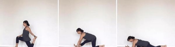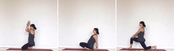 雷電坐進(jìn)入,雙腳腳趾向下壓地 臀部向后坐于腳后跟 保持核心收緊,停留1-2分鐘 之后雙腳腳背壓地,進(jìn)入金剛座 雙手向后撐地、身體重心向后 雙膝離開地面,停留1-2分鐘 右腿屈膝邁向前,左膝向后點(diǎn)地 保持脊柱延展,感受左腿前側(cè)拉伸 停留10-12個(gè)呼吸 動(dòng)作4-6、