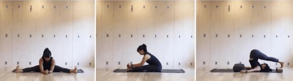 從鴿子式退出,進(jìn)入坐角式 雙腿橫向分開,腳尖回勾 身體微微向前屈,停留10-12個(gè)呼吸 從坐角式退出,進(jìn)入雙腿背部前屈 雙腿向前伸直,腳尖回勾 呼氣,收緊核心,身體向前屈 雙手抓腳掌,停留10-12個(gè)呼吸 之后仰臥,雙腿倒向身體后側(cè) 進(jìn)入犁式,停留10-12個(gè)呼吸 動(dòng)作10-12、