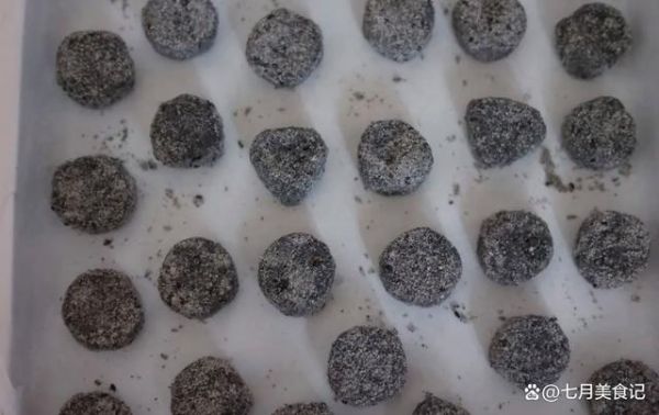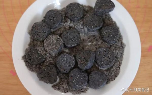冷凍好切成小片,在芝麻糖粉中滾一下(25g芝麻25細(xì)砂糖打成粉)