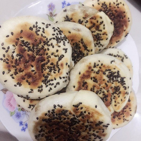 13. 平底鍋中小火加熱(不放油),將燒餅有芝麻的一面朝下烙3分鐘左右