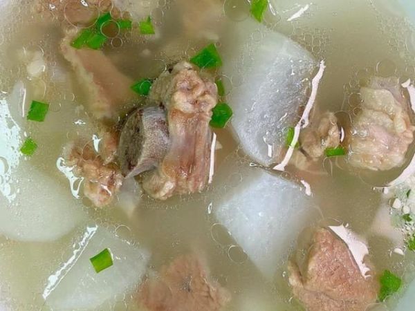 1、排骨剁成小段,清洗干凈后冷水下鍋焯水,放入姜片去腥,煮開后撇掉上邊的浮沫,再將排骨撈起來控干水分。白蘿卜削掉外皮,洗凈后切成小塊。