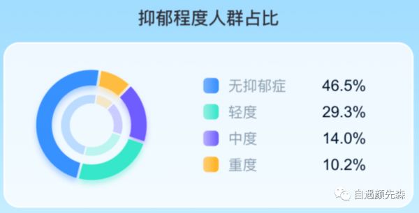 又據(jù)《中華精神科雜志》針對國內(nèi)近15000名普通民眾進(jìn)行心理健康狀況調(diào)查的結(jié)果顯示,人群抑郁癥狀陽性檢出率為53.5%,其中輕度抑郁占29.3%,中度抑郁占14.0%,重度抑郁占10.1%。而人群焦慮癥狀陽性檢出率為44.6%,其中輕度焦慮占27.8%,中度焦慮占10.2%,重度焦慮占6.6%。