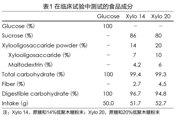 選擇12名19~35歲的健康男性和女性作為受試者,采用隨機分配,公開,單次取樣試驗設計。受試者按食物攝入順序進行分組:第一組[葡萄糖-Xylo 14-Xylo 20],第二組[Xylo 20-葡萄糖-Xylo 14],第三組[Xylo 14-Xylo 20-葡萄糖]以1:1:1的比例每周攝入,重復兩次,持續(xù)6周。臨床試驗結束后,根據既定標準排除1名偏離GI±2SD的受試者,選擇11名受試者進行最終評估。表1顯示了用于臨床試驗的標準食品和對比食品的組成