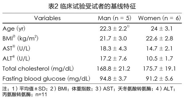 如表2所示,顯示了臨床試驗受試者的年齡、性別、體重指數(BMI)、天冬氨酸氨基轉移酶(AST)、丙氨酸氨基轉移酶(ALT)、總膽固醇和血糖水平。共有11名受試者參與了實驗,分別顯示了男性(5名)和女性(6名)的測試結果;男性平均年齡為22.3±2.2歲,女性平均年齡為24±3.1歲;男性和女性的BMI分別為21.7±3.0 kg/m2和22.6 ±2.8 kg/m2,大多數受試者在正常范圍內;血液檢測的AST水平為男性18.3±4.3 U/L,女性14.7±2.1 U/L,均在正常范圍內(男性0-40 U/L,女性0-32 U/L);ALT水平分別為男性17.2±7.6 U/L和女性10.5±1.7 U/L,沒有受試者超出正常范圍(男性:0-41 U/L,女性0-33 U/L);總膽固醇結果為男性168.8±21.2 mg/dl,女性175.7±19.1 mg/dl;空腹血糖為男性94.8±3.7 mg/dl,女性91.2±5.6 mg/dl,所有受試者都未偏離正常范圍 74~106 mg/dl;在吸煙狀況調查中,11名受試者中只有一名表示他們吸煙(數據未顯示)。