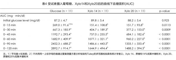 本研究將低聚木糖添加到糖中,并通過臨床試驗證實了低聚木糖-糖混合物降低GI和血糖的作用。食用葡萄糖、Xylo 14和含Xylo 20后,比較11名健康成年男性和女性的GI,發(fā)現Xylo 14為中GI食物,Xylo 20為低GI食物;與純糖的GI 68相比,升糖量分別降低了11.8%和20.1%;AUC在15-90min的所有區(qū)間顯示顯著差異(p<0.05);因此Xylo 14和Xylo 20具有降低血糖的作用,有望作為功能性糖降低食用者血糖。