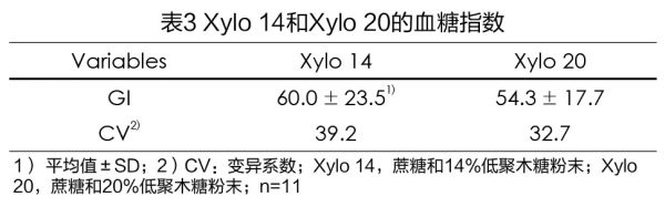 如表3所示,顯示了臨床試驗受試者攝取的Xylo 14和Xylo 20的IAUC計算的GI結果。純糖的GI值為68,相比之下,Xylo 14的GI為60.0±23.5,比純糖低11.8%;Xylo 20的GI為54.3±17.7,比純糖低20.1%;就GI水平而言,Xylo 14和Xyl 20可分為中等GI和低GI,因此,與純糖相比, Xylo 14或Xylo 20的碳水化合物吸收率較低,有助于降低血糖。