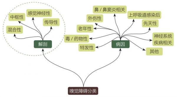 此外,根據(jù)解剖部位,臨床上將嗅覺障礙分為4類;根據(jù)病因,嗅覺障礙又分為9類。