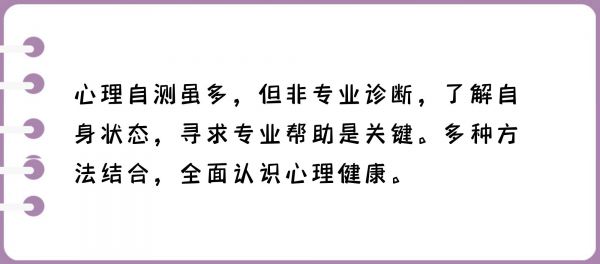 心理自測只是一種輔助手段,不能替代專業(yè)診斷。在進行心理自測時,要認識到其局限性,并且如果發(fā)現可能存在心理問題,應該及時尋求專業(yè)的幫助。同時,不同的心理自測方法都有其特點,例如自我評估問卷雖然簡單易行,但結果的準確性有限;日常表現自我評估比較直觀,但不夠精確等。所以在進行心理自測時,最好綜合多種方法來對自己的心理狀態(tài)有一個更全面的初步認識。