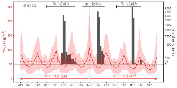 圖1. 《大氣十條》實(shí)施前后調(diào)查城市平均PM2.5濃度變化趨勢(shì)(紅色時(shí)間序列圖和左側(cè)y坐標(biāo))及三次訪視期間人群調(diào)查的時(shí)間段(灰色柱狀圖和右側(cè)y坐標(biāo))
