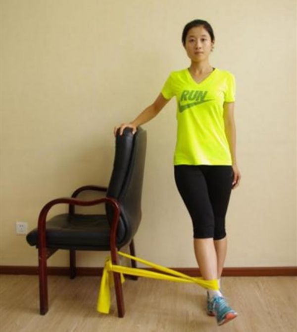 ?。?)固定彈力帶一端,另一端固定在腳踝上,身體側對彈力帶;